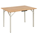 Stilvoller Tisch in modernem Design. Gefertigt aus langlebigen Materialien, ausgestattet mit strapazierfähiger Bambustischplatte und Aluminiumrahmen. Sekundenschneller Auf- und Abbau. Praktische Griffe ermöglichen bequemen Transport. Kleines Packmaß. Verstellbare Füße.